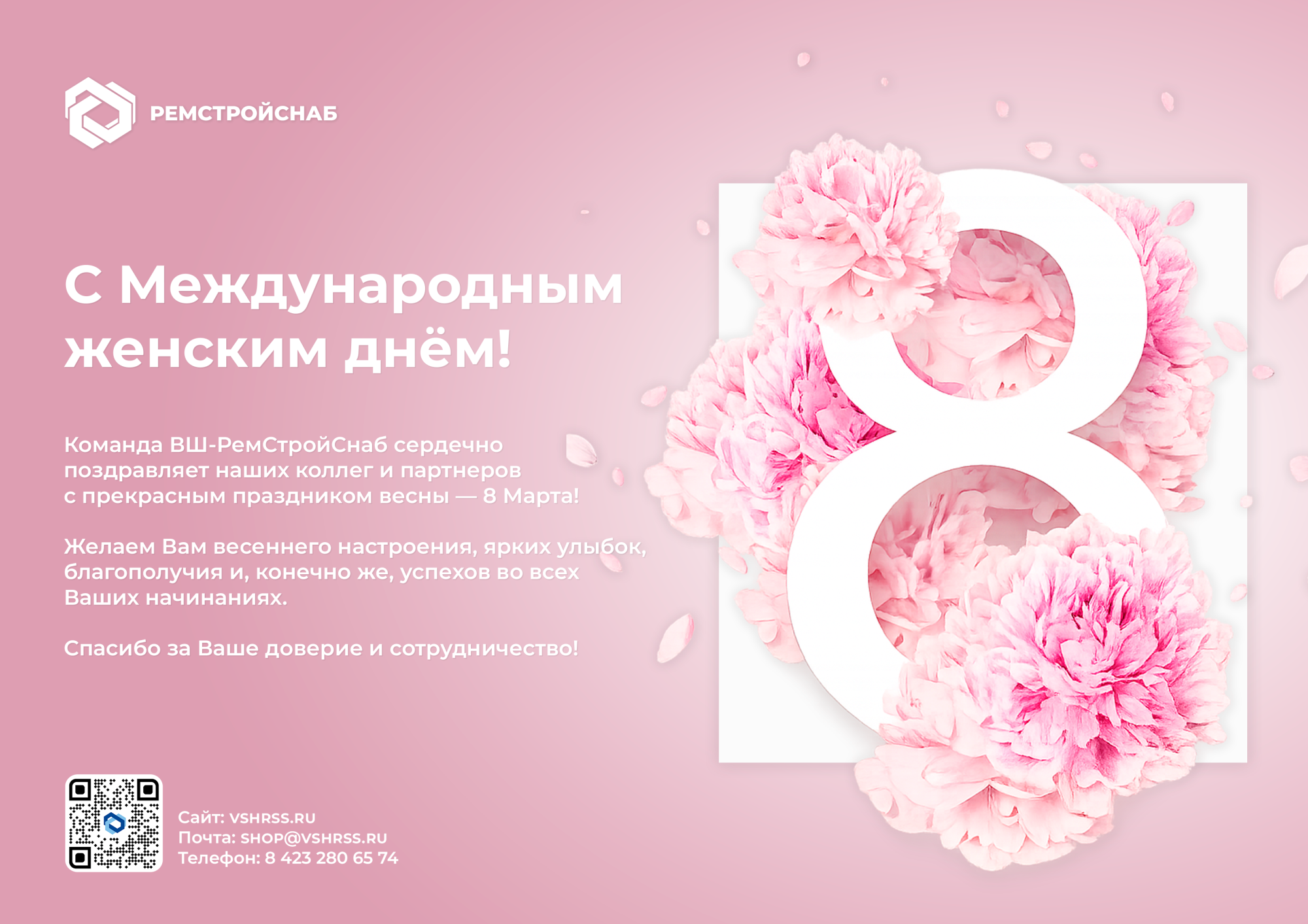 Команда ВШ-РемСтройСнаб сердечно поздравляет наших коллег и партнеров с прекрасным праздником весны — 8 Марта!
